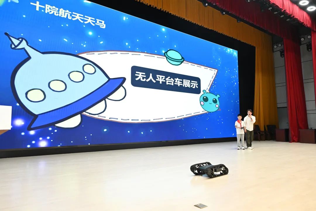 “同學們,你們知道火箭是怎么飛上天的嗎?”在活動現場,十院十部青年講師石龐從一個問答開始,為小朋友們帶來了一場趣味橫生的航天科普課堂?!爸袊夤趋揽梢詭臀姨?!”“看!那個無人車可以上樓梯!”十院航天天馬無人平臺車和十院航天控制外骨骼展示,瞬間點燃了現場氛圍。