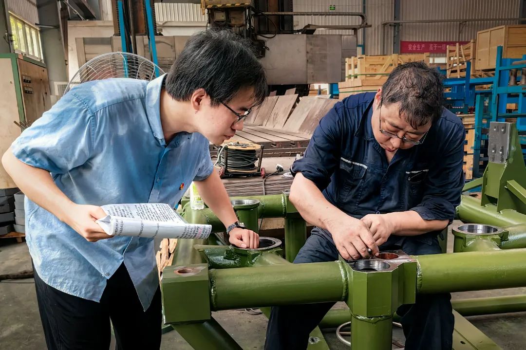 暑氣蒸騰,車間如爐。萬山公司車間里,年輕的技術員俯身與操作者在操作現場共商方案,滾落的汗珠浸透工裝,勾勒出他們專注的身影。(圖文/王小芳 劉澤華)
