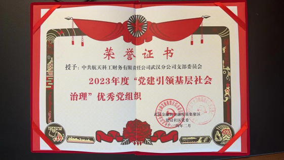 分公司黨支部長期堅持以人民為中心的發展思想,以實際行動履行社會責任,積極為和諧社會貢獻航天力量,被武漢金融街金融發展集聚區建設社區黨委授予2023年度“黨建引領基層社會治理”優秀黨組織榮譽稱號。(文/李強)